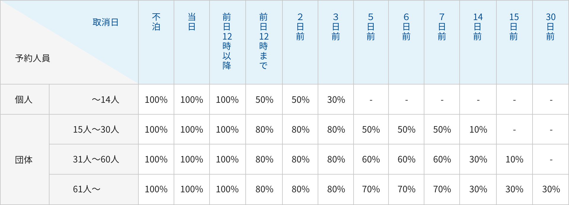 14名様までのご予約の場合、3日前よりキャンセル料が発生します。詳細は以下をご確認ください。